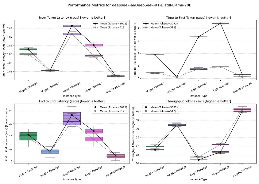 DeepSeek-R1-Distill-Llama-70B在ml.g5.48xlarge、ml.g6.48xlarge、ml.g6e.12xlarge、ml.g6e.48xlarge和ml.p4dn.24xlarge上进行了测试。最佳性能是在ml.p4dn.24xlarge上观察到的,其次是ml.g6e.48xlarge,然后是ml.g6e.12xlarge,ml.g5.48xlarge,最后是ml.g6.48xlarge。