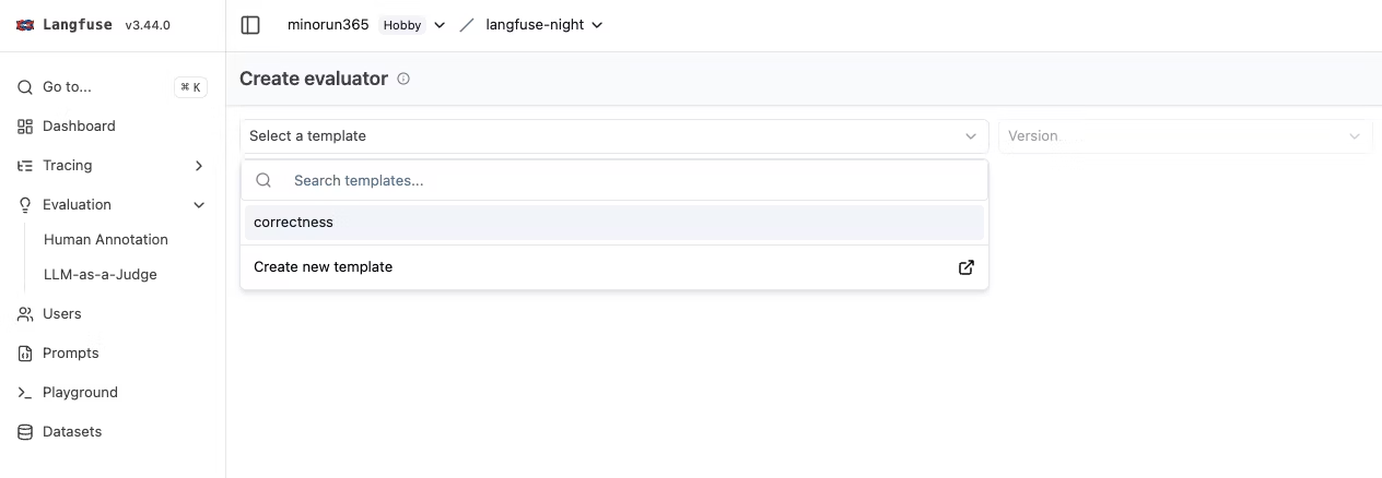 - 在Langfuse左侧边栏中打开“Evaluation > LLM-as-a-Judge”,然后点击“Create Evaluator”。