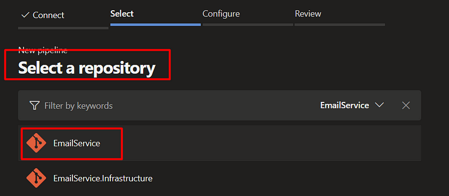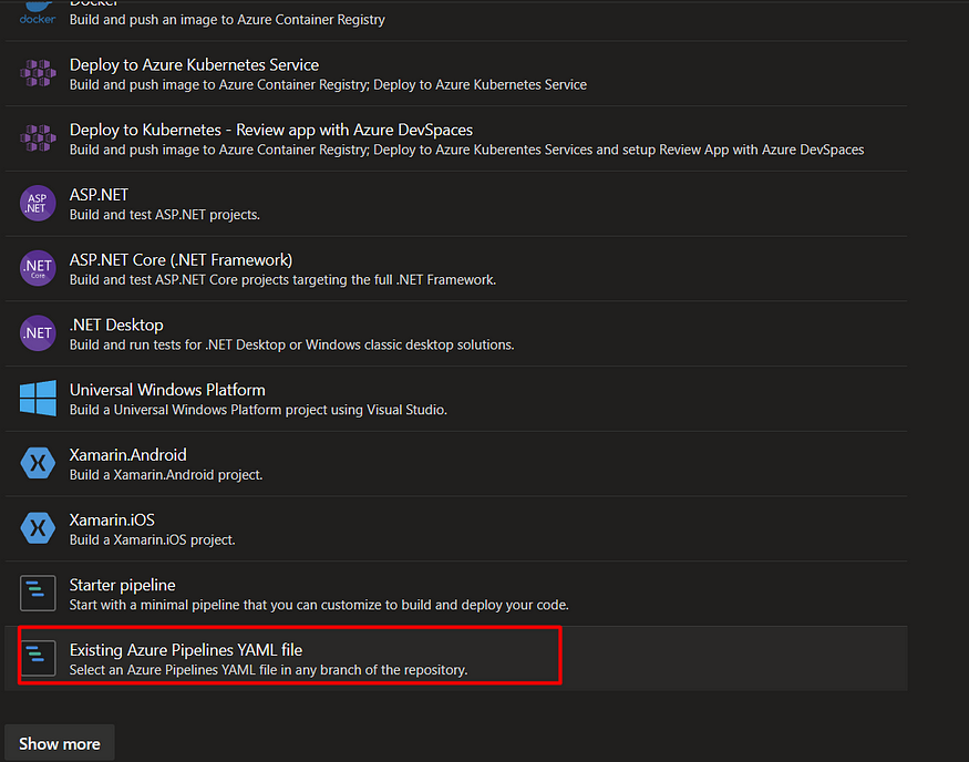 首先需要创建带有逻辑和代码的文件。之后配置Pipeline并从存储库中选择适当的文件 - azure-pilelines.yml。