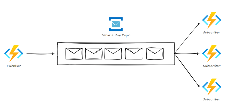 通过Azure中的一个示例,我们可以有一个Azure Function发送消息到服务总线主题。一个主题可以有多个订阅者,每个订阅者都可以注册到主题上。如果我们有多个作为主题订阅者的Azure Function,每个订阅者都会从主题中接收到他们自己的消息副本。