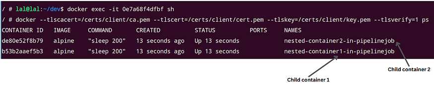 - docker run -d --rm --name nested-container1-in-pipelinejob alpine sleep 20