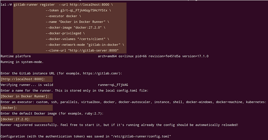 最后,我们将网络设置为gitlab-in-docker,这是我们的自定义网络,并将克隆URL设置为前面讨论的http://gitlab-server:8000。