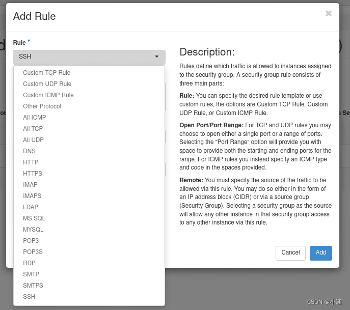 - 在规则下,您可以指定自定义规则,但也可以使用预定义的SSH规则。让我们选择这个。