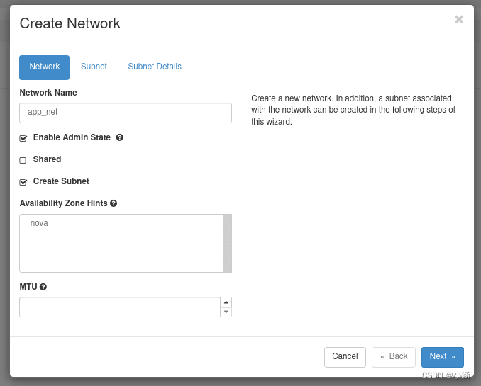 在图表底部,我们应该选择创建网络以打开新网络对话框。在此对话框中,我们需要指定以下项目: